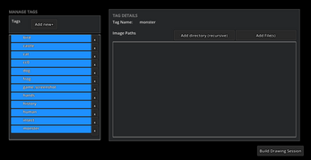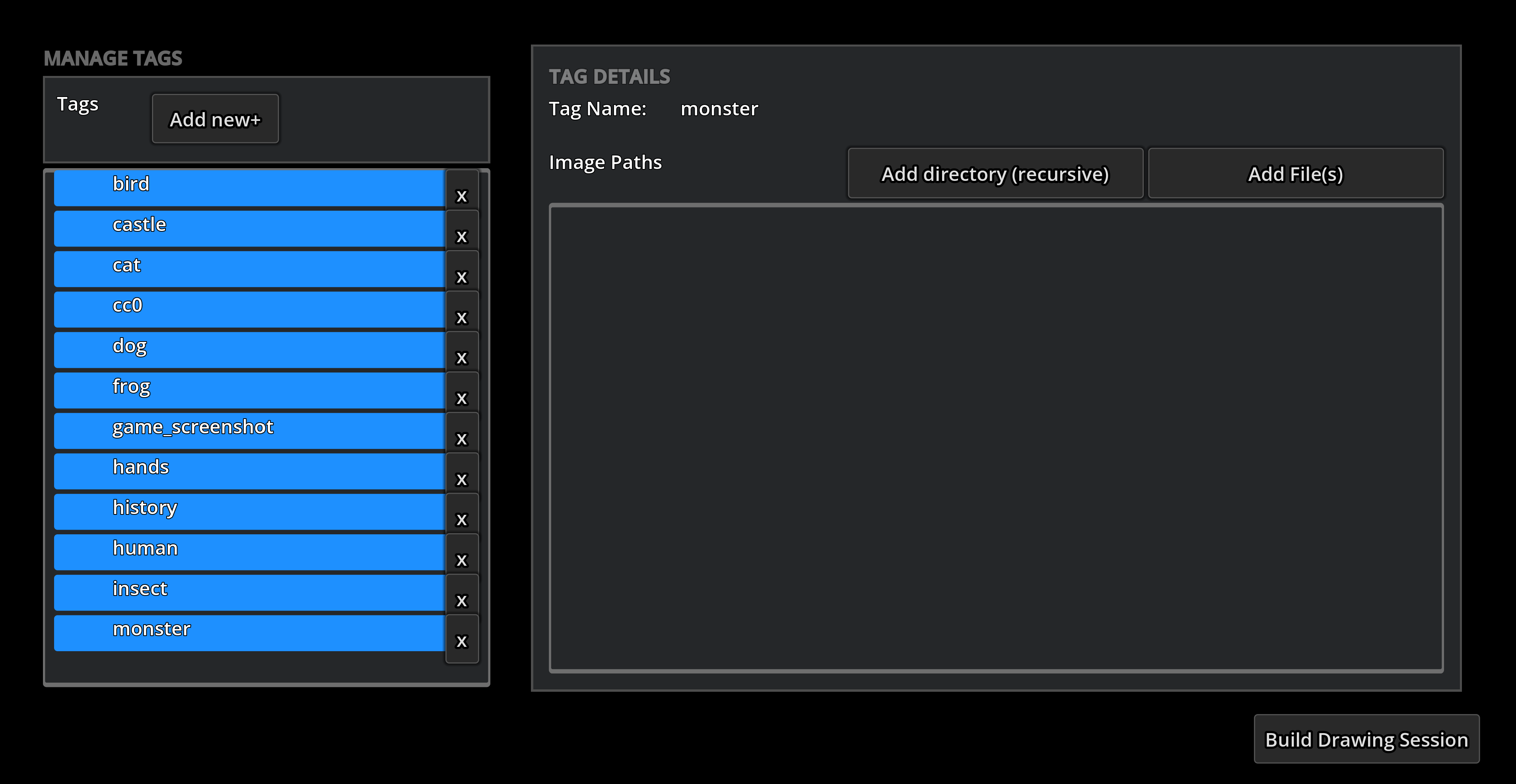 The basic usage of the app is that you create one or more "tags" which are like categories of images. You can then associate any number of folders containing images (the app will search the directories recursively) or individual image files with each tag.